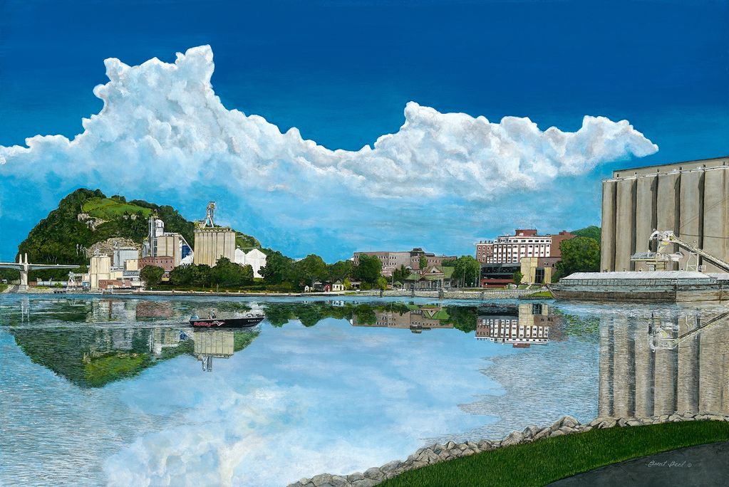 I took my resource photo for this painting at Bay Point Park in Red Wing, MN. This is a great water level view of the city and river traffic in Red Wing. This great water level view was the inspiration behind my title. It is the reverse view of "Red Wing Swing